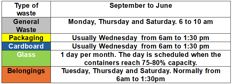 Se les informa del nuevo horario de recogida de residuos. Les rogamos que colaboren con el buen estado del resort, haciendo coincidir el depósito de las bolsas los días de recogida.